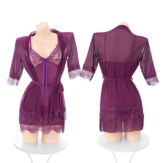 Fee Et Moi - Sheer Lace-Trim Robe Lingerie Dress Set