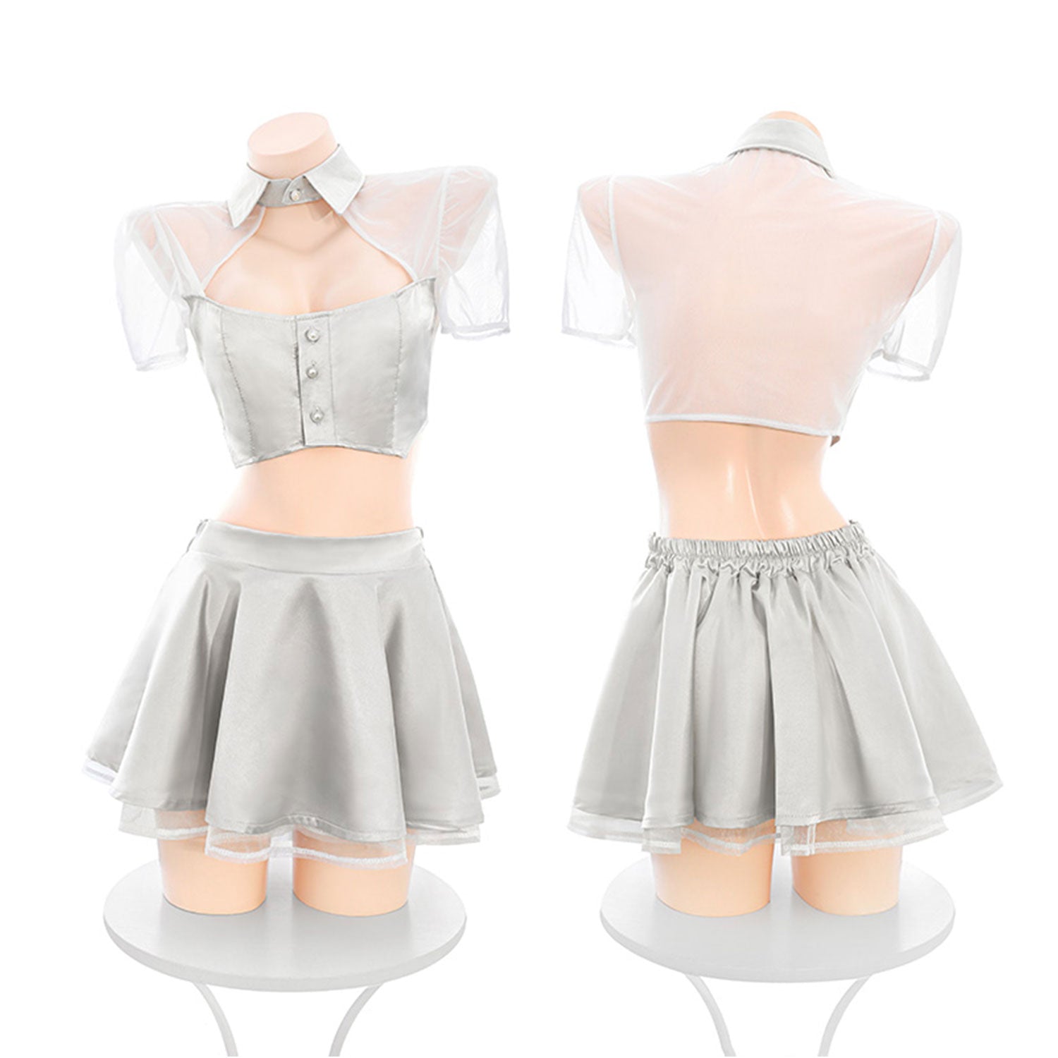 Shine like a star in the K-Pop Idol Fantasy Lingerie Set Silver by Fee Et Moi. Inspired by the glamorous world of K-pop performances, this shimmering two-piece outfit blends stage-ready confidence with delicate, feminine charm. The satin crop top features button accents and a sheer mesh overlay that catches the light beautifully, while the flared mini skirt sways with every playful movement.
