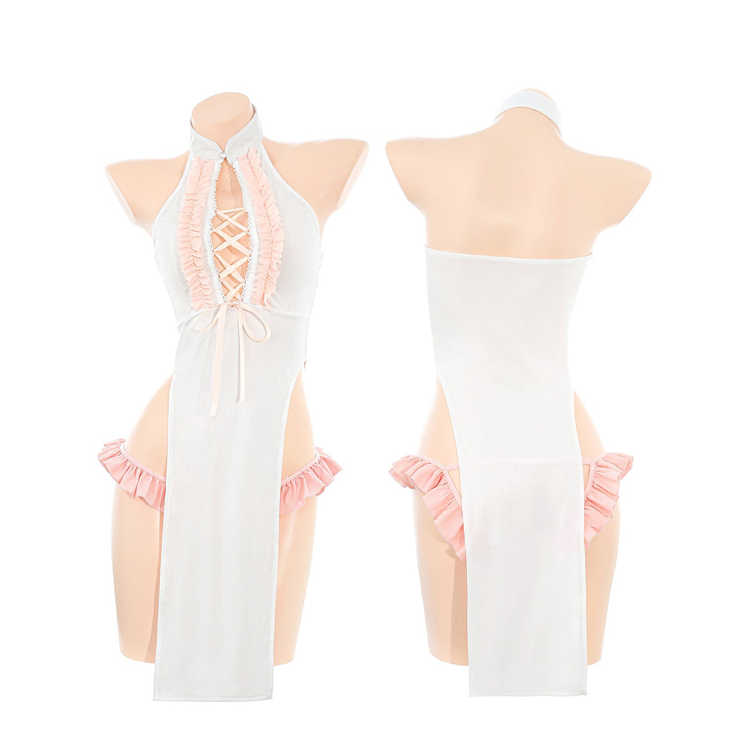 Designed to flatter from every angle, this cheongsam-inspired lingerie set balances elegance with confident sensuality. The halter neckline draws attention to the shoulders and collarbone, while the lace up front detail allows you to adjust the fit to your body. High side slits create a leg-lengthening effect, and the backless silhouette adds a daring finish without feeling overdone.