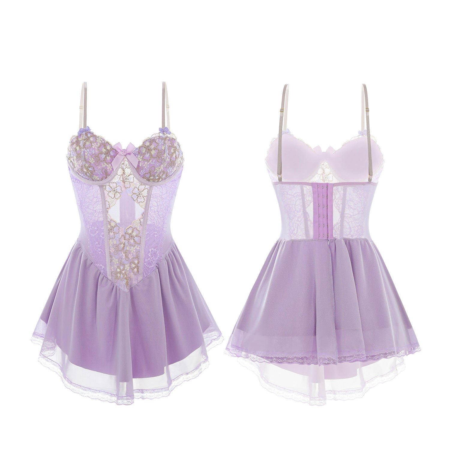 Fall into a world of soft romance with the Fee Et Moi Purple Dream Babydoll Dress. Crafted from delicate floral lace and whisper-light mesh, this dreamy piece blends sweetness with irresistible allure. The underwired lace cups offer gentle shaping, while satin bow accents add a charming, feminine touch. The flowing mesh skirt drapes gracefully around your hips, creating a soft, fluttery silhouette with every step.