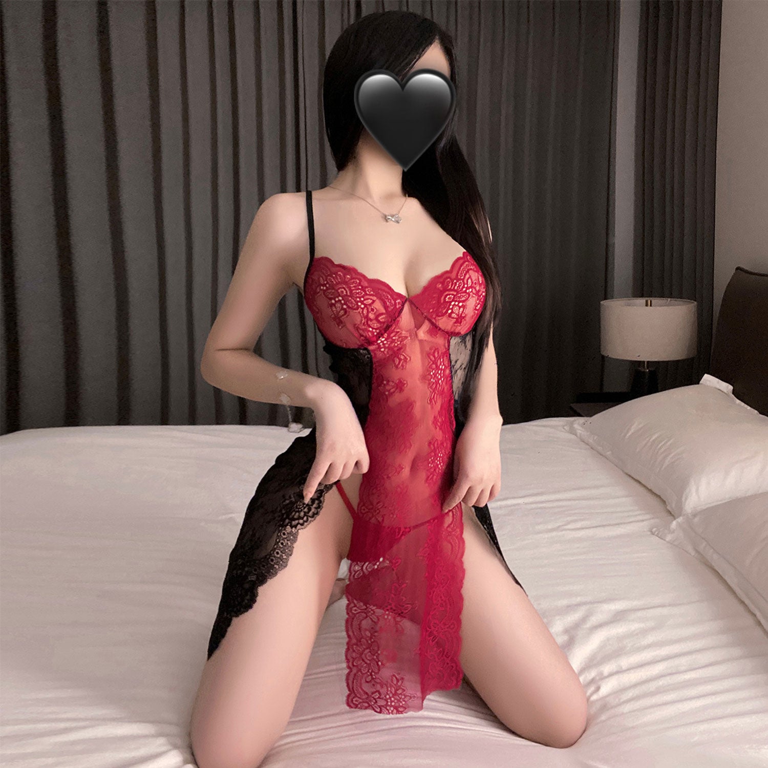 Sultry, sheer, and slit to seduce. The Fee Et Moi Two-Tone Lace Slit Night Dress blends dramatic allure with delicate femininity. A striking crimson lace panel runs down the front, beautifully contrasted by sheer black mesh that skims the body and teases just the right amount of skin. High side slits elongate your silhouette and highlight your hips for an unmistakably seductive finish.